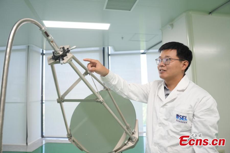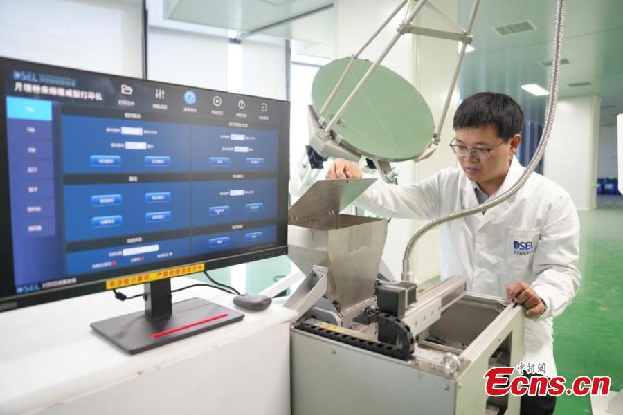 A scientist inspects displays a 3D-printing robot for "lunar bricks"at China's deep space exploration laboratory, April 18, 2025. (Photo: China News Service/Zhang Jun)