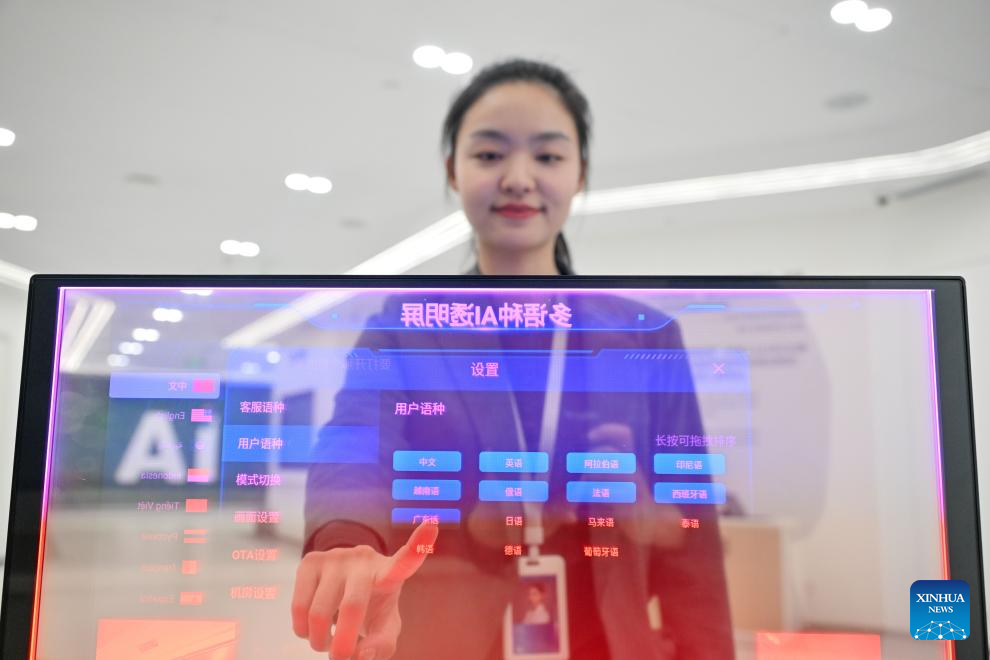 A staff member shows a multi-language AI real-time translation system with transparent screen at Tianjin branch of iFLYTEK in Tianjin, north China, April 18, 2025. In recent years, a batch of digital technology-based companies have fostered their development at a digital economy industrial park in Tianjin, injecting impetus into the high-quality development of local economy. (Xinhua/Sun Fanyue)