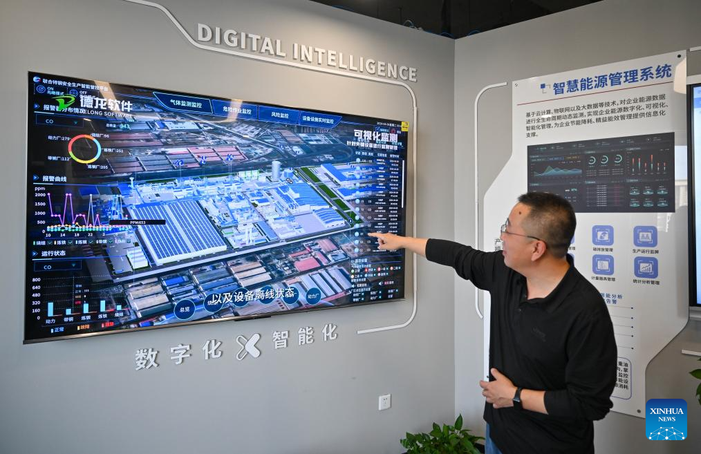 A staff member introduces a monitor software applied for industrial production at a software company in Tianjin, north China, April 18, 2025. In recent years, a batch of digital technology-based companies have fostered their development at a digital economy industrial park in Tianjin, injecting impetus into the high-quality development of local economy. (Xinhua/Sun Fanyue)