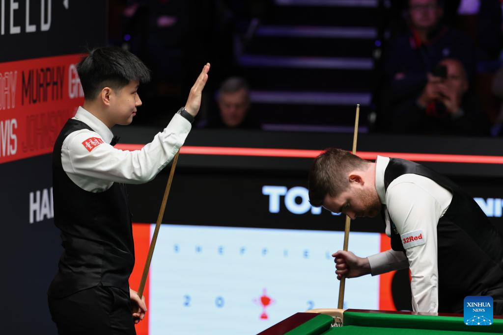 Zhao Xintong (L) of China greets spectators after winning the round 1 match against Jak Jones of Wales at World Snooker Championship 2025 in Sheffield, Britain, April 21, 2025. (Photo by Zhai Zheng/Xinhua)