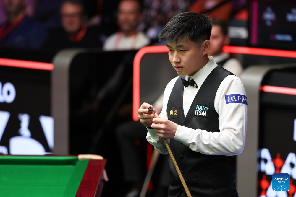 Zhao Xintong of China chalks his cue during the round 1 match against Jak Jones of Wales at World Snooker Championship 2025 in Sheffield, Britain, April 21, 2025. (Photo by Zhai Zheng/Xinhua)