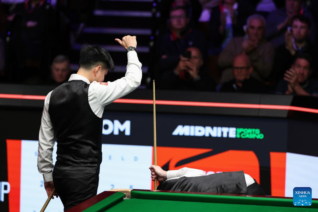 Zhao Xintong (L) of China celebrates after winning the round 1 match against Jak Jones of Wales at World Snooker Championship 2025 in Sheffield, Britain, April 21, 2025. (Photo by Zhai Zheng/Xinhua)