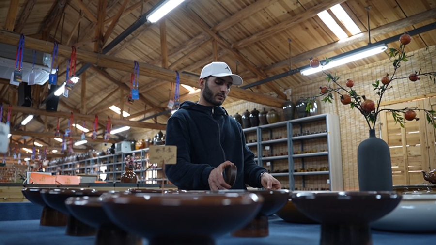 A foreign visitor watches pottery wares in Doumu township, Qianshan city, east China's Anhui Province. (Photo/People's Daily Online)
