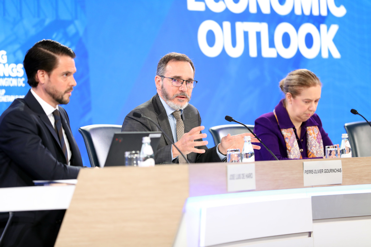 The International Monetary Fund's chief economist Pierre-Olivier Gourinchas (center), speaks at a press conference to discuss the IMF's World Economic Outlook during the IMF/World Bank Spring Meetings at the IMF Headquarters in Washington on Tuesday. [Photo by Zhao Huanxin / China Daily]