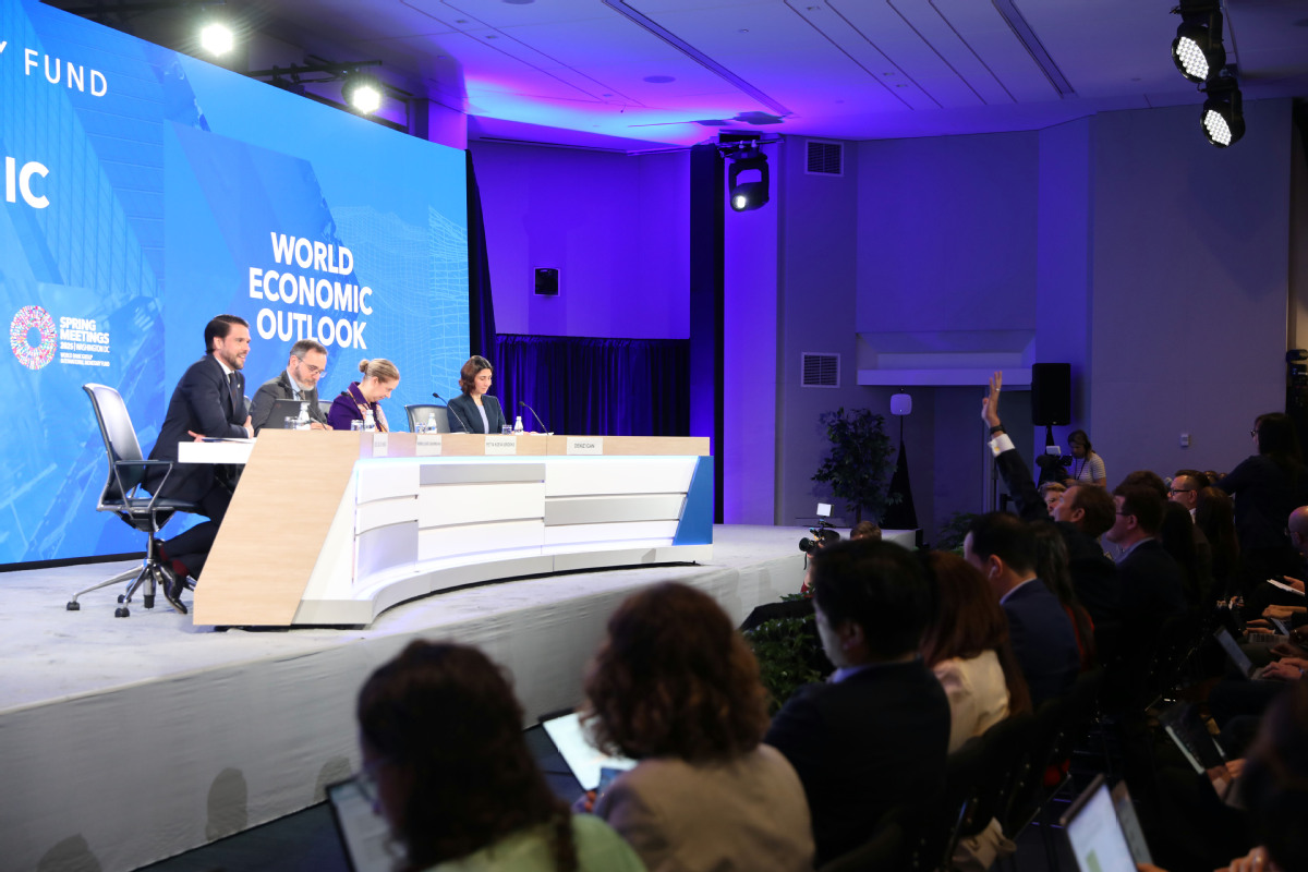 The International Monetary Fund holds a press conference to discuss the IMF's World Economic Outlook during the IMF/World Bank Spring Meetings at the IMF Headquarters in Washington on Tuesday. [Photo by Zhao Huanxin / China Daily]