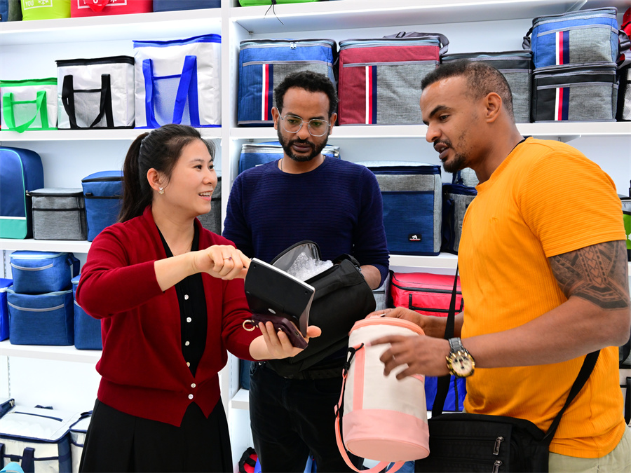 A merchant negotiates prices for insulated bags with Ethiopian traders at the market on April 15.[SHI BUFA/FOR CHINA DAILY]