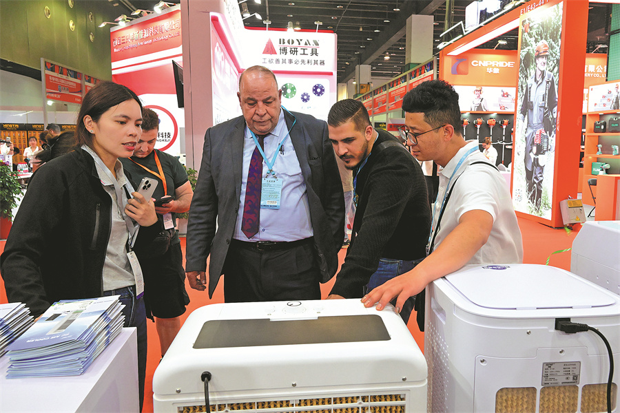 Overseas traders learn about air coolers during an electrical appliance fair in Yiwu on April 20. [SHI BUFA/FOR CHINA DAILY]