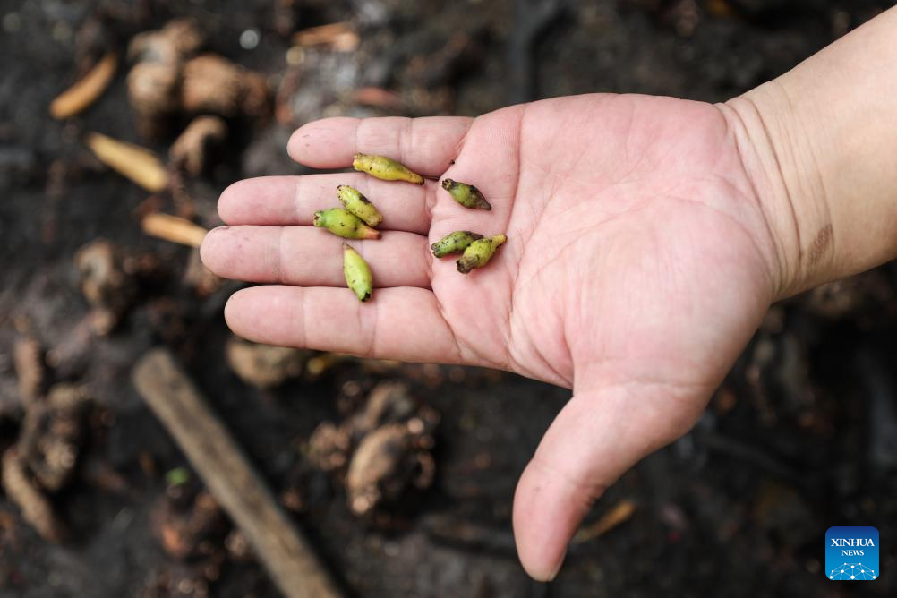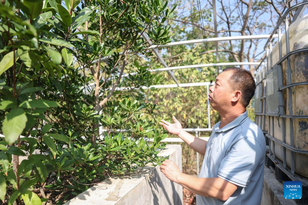 Zeng Dehua, a researcher from Sanya Academy of Forestry, checks Lumnitzera littorea seedlings at the academy in Sanya, south China's Hainan Province, April 9, 2025. (Xinhua/Zhang Liyun)