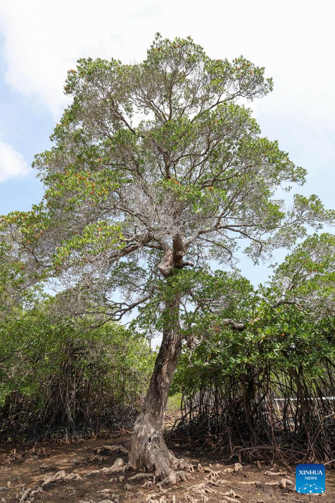 A century-old Lumnitzera littorea plant blooms at Tielu port mangrove nature reserve in Sanya, south China's Hainan Province, April 9, 2025. (Xinhua/Zhang Liyun)