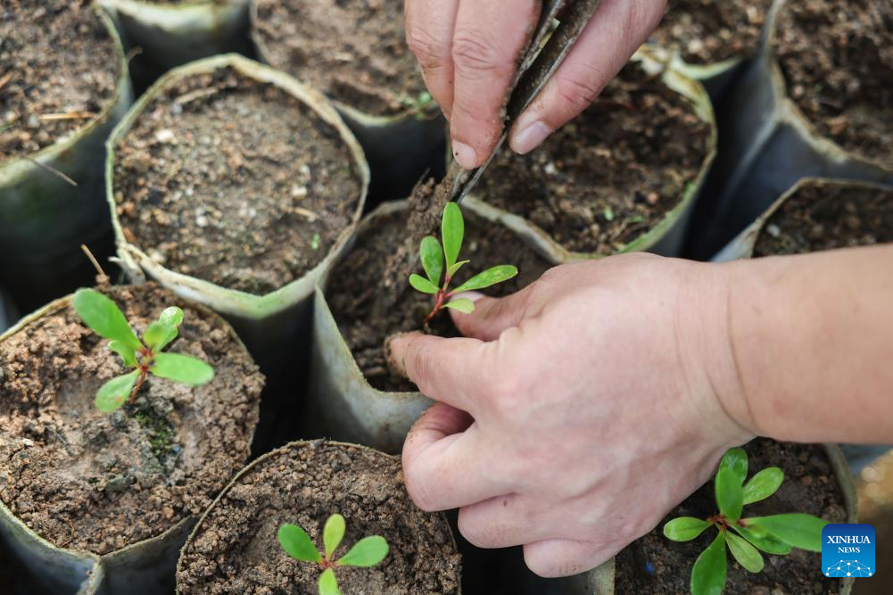 Zeng Dehua, a researcher from Sanya Academy of Forestry, transplants a Lumnitzera littorea seedling at a greenhouse of the academy in Sanya, south China's Hainan Province, April 9, 2025. (Xinhua/Zhang Liyun)