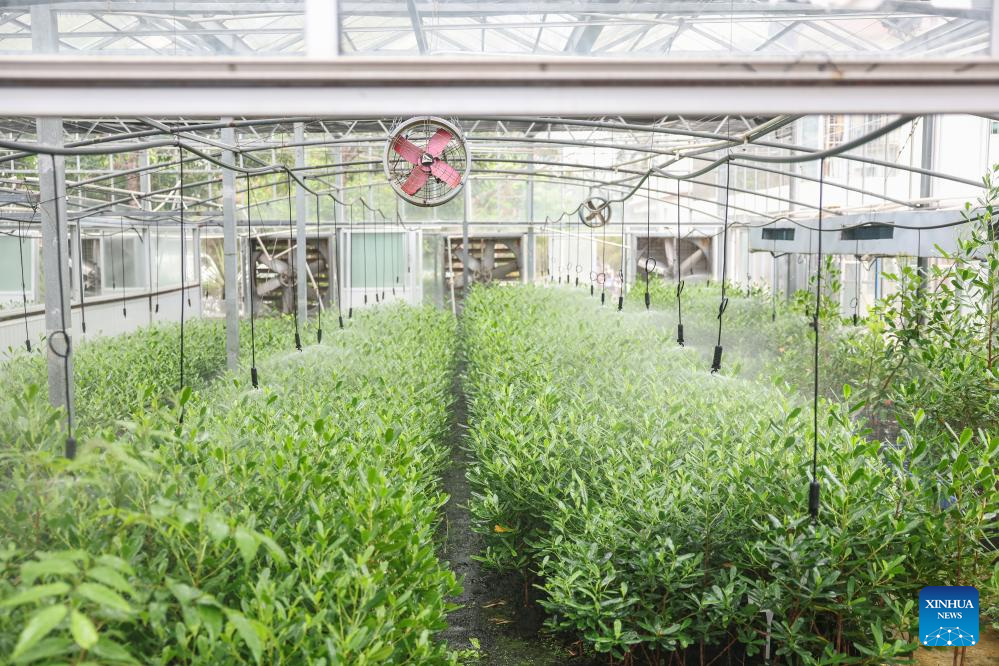 Lumnitzera littorea seedlings are pictured at a greenhouse of Sanya Academy of Forestry in Sanya, south China's Hainan Province, April 10, 2025. (Xinhua/Zhang Liyun)