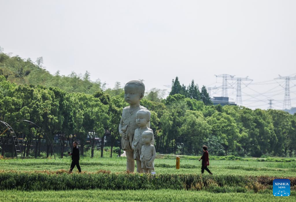 Villagers walk past an exhibited art work in the fields in Donglin Town, Huzhou City of east China's Zhejiang Province, on April 25, 2025. A land art event kicked off in the wheat fields in Donglin Town on Friday. Teachers and students from many Chinese fine arts academies formed the core creative team, producing 42 land art pieces here.