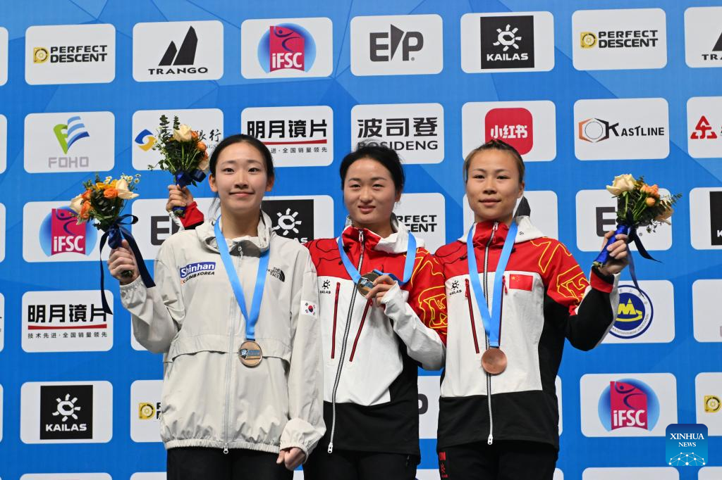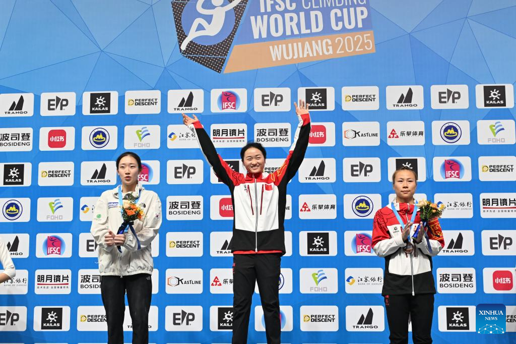 Gold medalist Zhang Shaoqin (C) of China, silver medalist Jeong Jimin (L) of South Korea and bronze medalist Deng Lijuan of China pose during the awarding ceremony for the women's speed final at the IFSC World Cup Wujiang 2025 in Suzhou, east China's Jiangsu Province, April 26, 2025. (Photo by Wang Xuzhong/Xinhua)