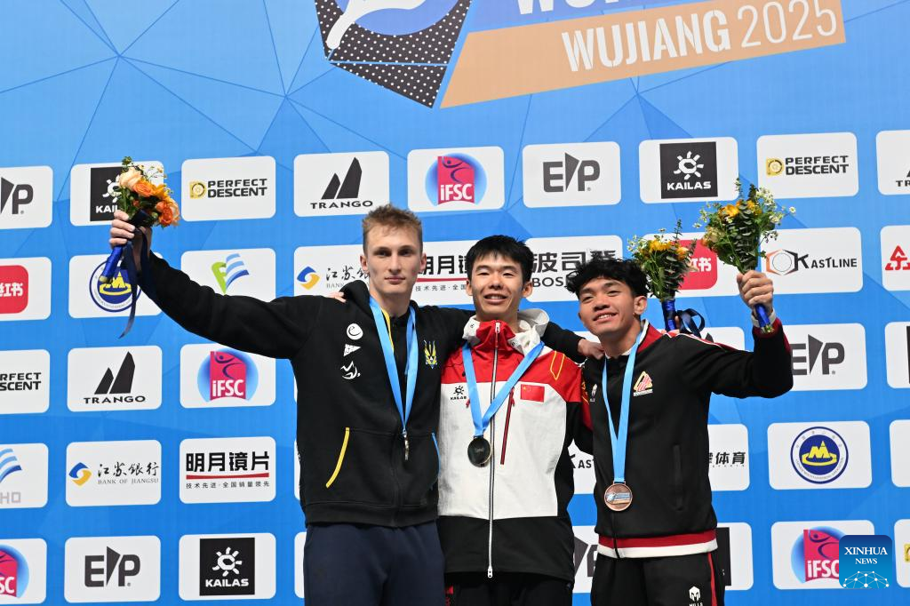 Gold medalist Long Jianguo (C) of China, silver medalist Hryhorii Ilchyshyn (L) of Ukraine and bronze medalist Kiromal Katibin of Indonesia pose during the awarding ceremony for the men's speed final at the IFSC World Cup Wujiang 2025 in Suzhou, east China's Jiangsu Province, April 26, 2025. (Photo by Wang Xuzhong/Xinhua)