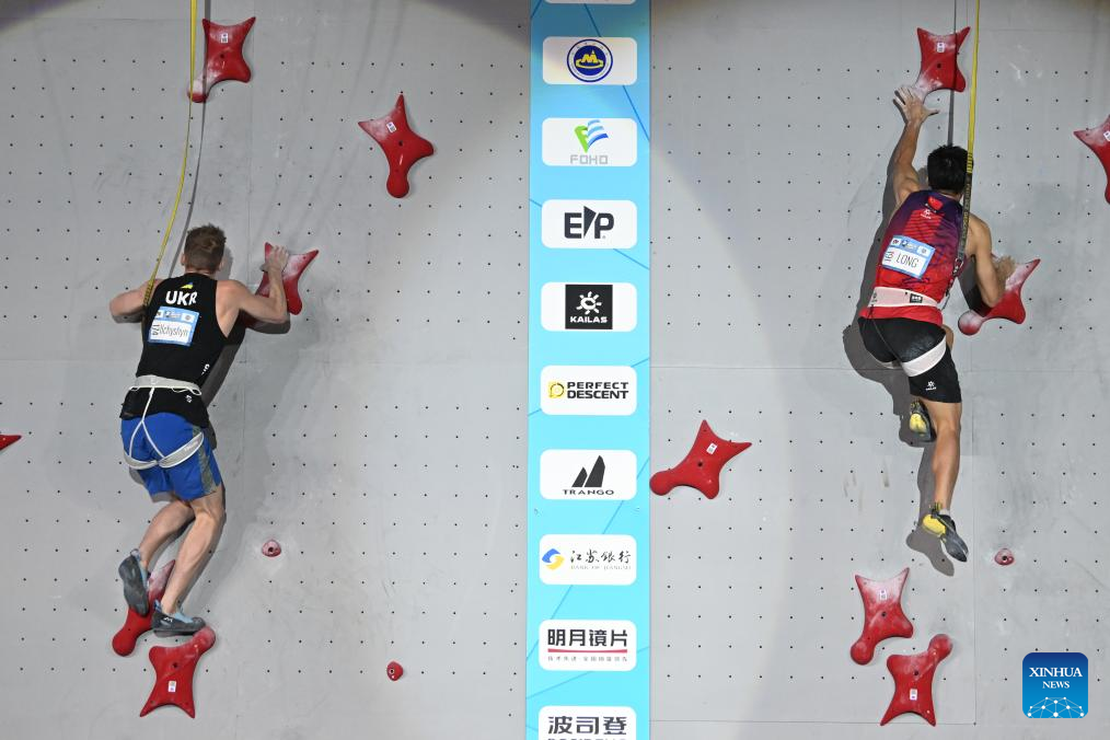 Long Jianguo (R) of China and Hryhorii Ilchyshyn of Ukraine compete during the men's speed final at the IFSC World Cup Wujiang 2025 in Suzhou, east China's Jiangsu Province, April 26, 2025. (Photo by Wang Xuzhong/Xinhua)