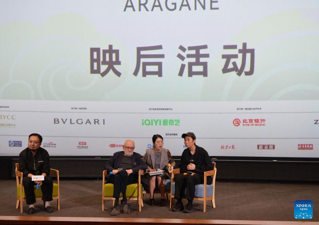Hungarian film director Bela Tarr (2nd L) and Japanese film director Kaori Oda (R) attend an activity after the screening of Aragane during the 15th Beijing International Film Festival in Beijing, capital of China, April 24, 2025. (Xinhua/Xiao Xiao)