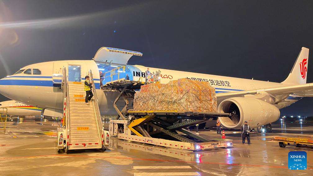 Goods are loaded onto a plane bound for Dubai in the United Arab Emirates (UAE) at Chengdu Shuangliu International Airport in Chengdu, southwest China's Sichuan Province, April 26, 2025. On Friday, 14 new international passenger and cargo routes connecting Chengdu, the capital of southwest China's Sichuan Province, with 13 global destinations are unveiled, according to Sichuan Province Airport Group Co., Ltd. The 13 global destinations include Paris, Madrid, Athens, Dubai, as well as Tokyo, Bali and Penang. (Air China Cargo/Handout via Xinhua)
