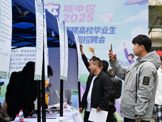 Students learn about recruitment information during a campus job fair held at Qinghai College of Architectural Technology in Xining, northwest China's Qinghai Province, April 23, 2025. The job fair was attended by 45 employers who provided more than 1,700 vacancies to job seekers. (Xinhua/Qi Zhiyue)