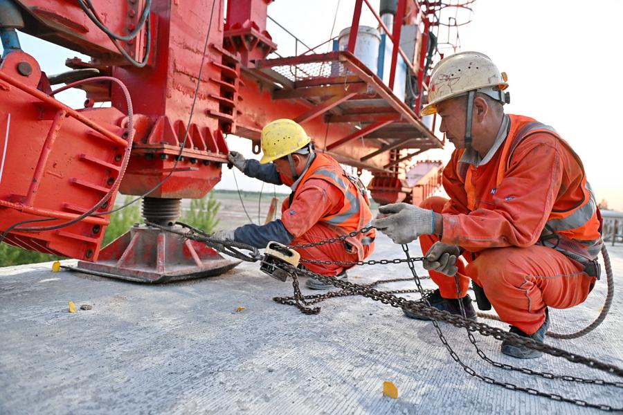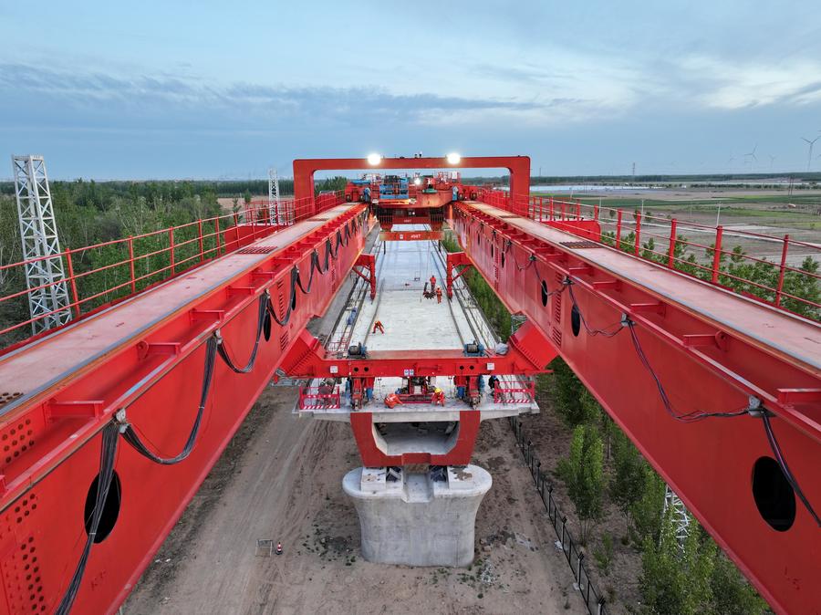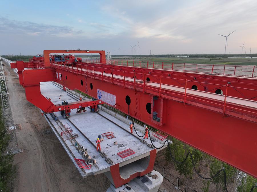 Workers erect a box girder at the construction site of a mega bridge in the Hebei section of the Xiong'an-Shangqiu high-speed railway in north China's Hebei Province, April 27, 2025. (Xinhua/Mu Yu)