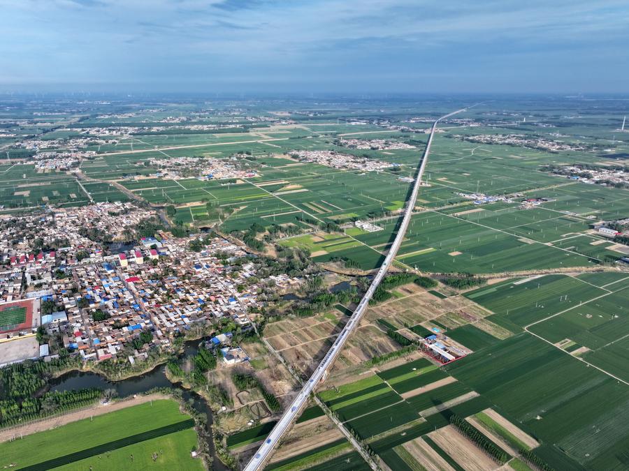 An aerial drone photo taken on April 27, 2025 shows the construction site of the Hebei section of the Xiong'an-Shangqiu high-speed railway in Qinghe County, north China's Hebei Province. (Xinhua/Mu Yu)