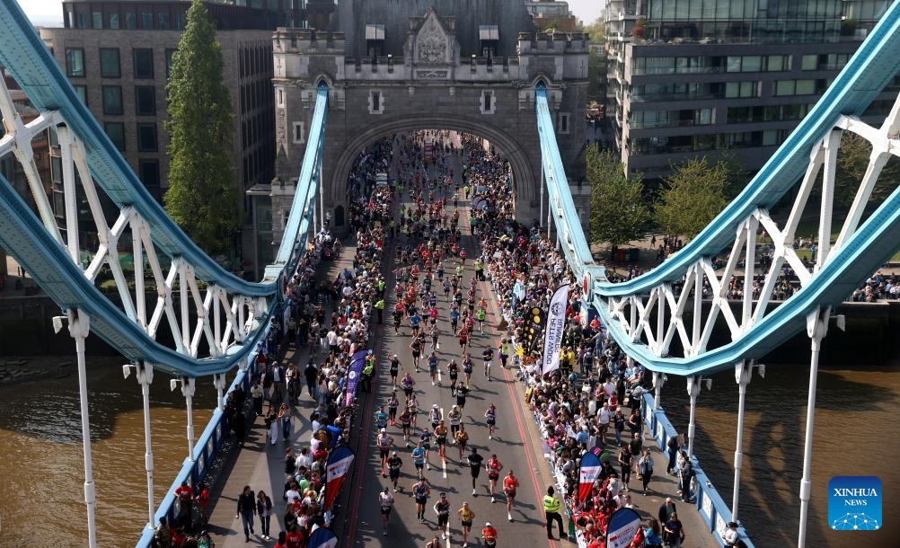 Athletes run through Tower Bridge at the 2025 London Marathon in London, Britain, April 27, 2025. (Xinhua/Li Ying)