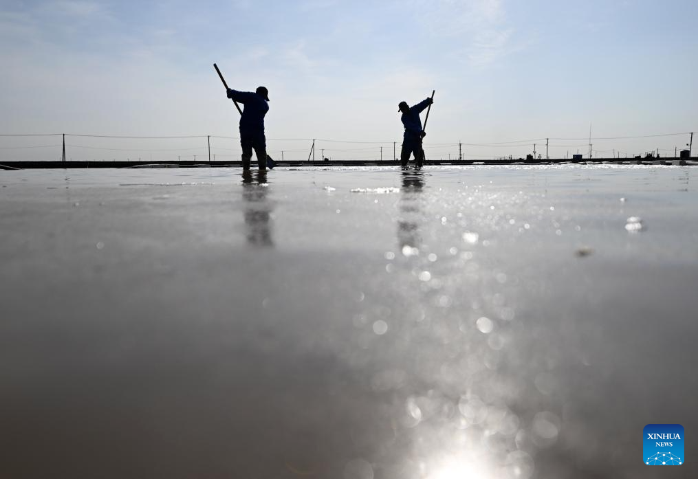 Workers harvest salt in a salt flat of Tianjin Changlu Haijing Group Co., Ltd. in Tianjin, north China, April 27, 2025.