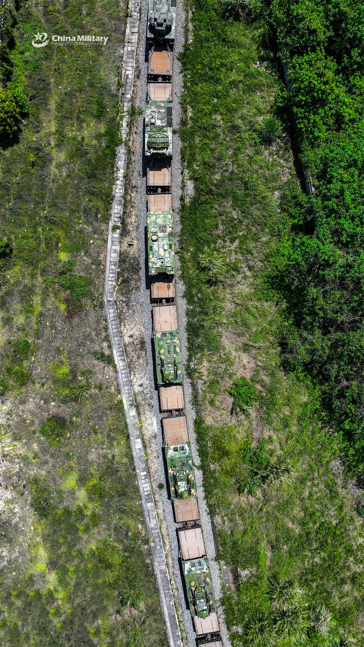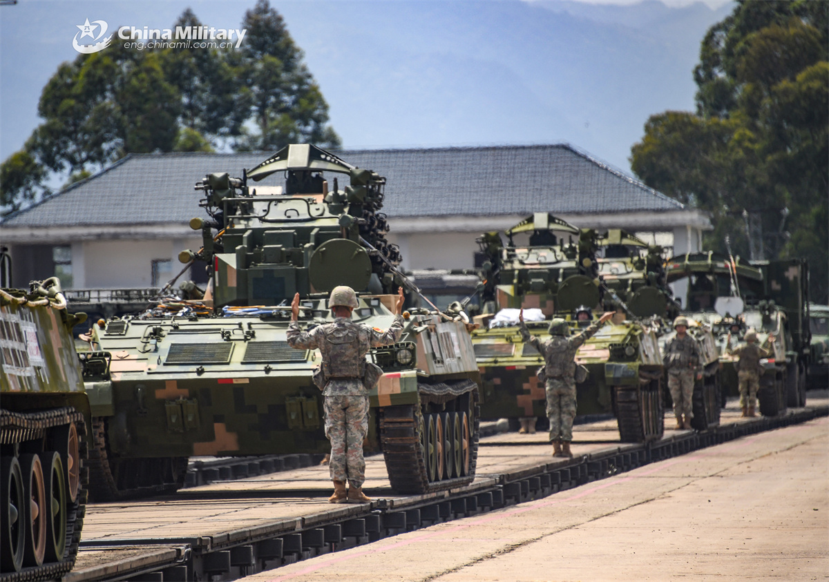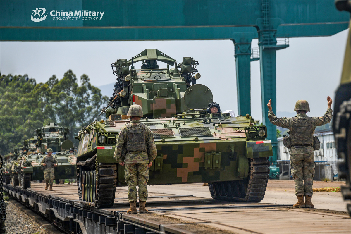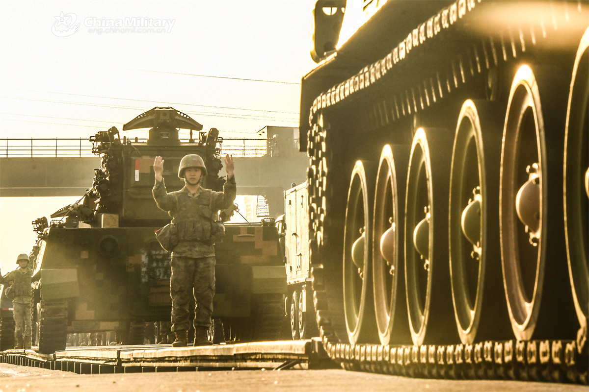 Soldiers assigned to an air-defense unit with a brigade under the Chinese PLA 73rd Group Army direct the armored vehicles to drive onto the rail car during a rail-load training exercise, aiming to enhance the troops' long-distance transportation capability on April 23, 2025. (eng.chinamil.com.cn/Photo by Liu Zhiyong)