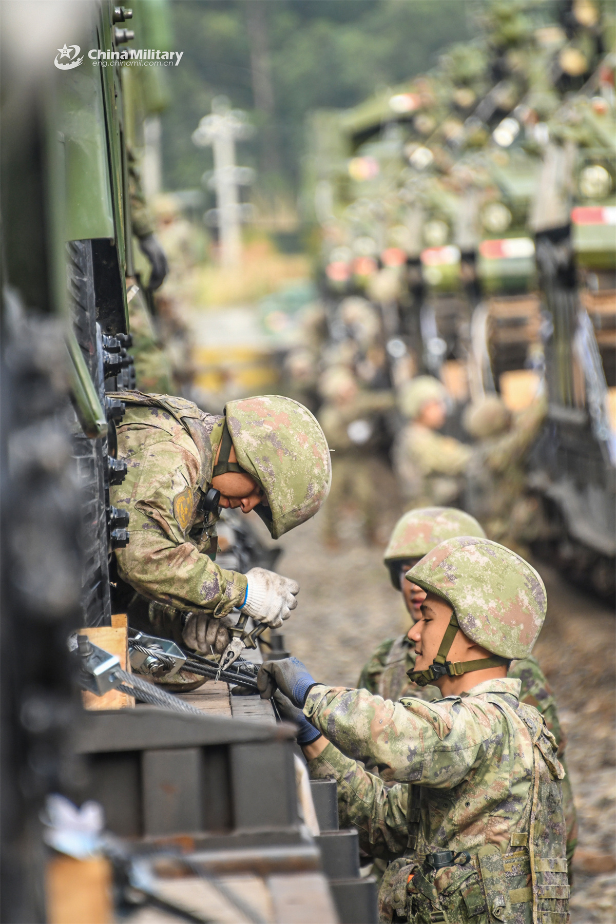 Soldiers assigned to an air-defense unit with a brigade under the Chinese PLA 73rd Group Army secure the armored vehicle onto the rail car during a rail-load training exercise, aiming to enhance the troops' long-distance transportation capability on April 23, 2025. (eng.chinamil.com.cn/Photo by Liu Zhiyong)