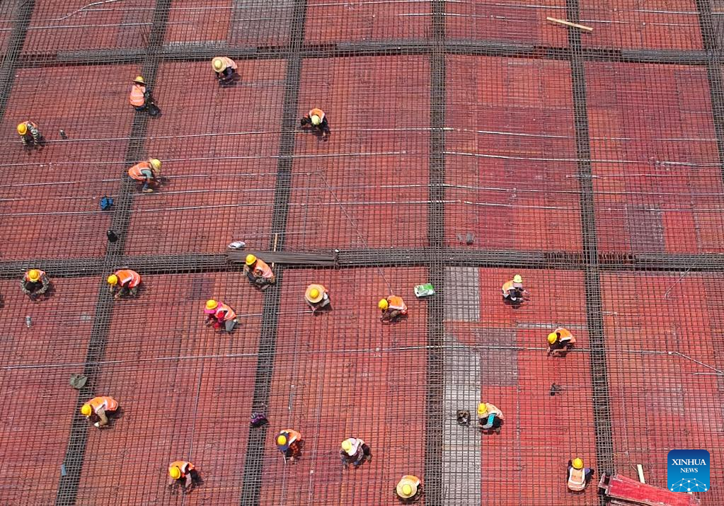 An aerial drone photo taken on April 29, 2025 shows a construction site for the supporting tourism facilities on Wuzhizhou Island, Sanya, south China's Hainan Province. Construction of the supporting tourism facilities on Sanya's Wuzhizhou Island, a national-level tourist attraction, is progressing at an accelerated pace. Upon completion, the project is expected to boost tourism accommodation capacity while serving environmental protection purposes. (Xinhua/Zhao Yingquan)