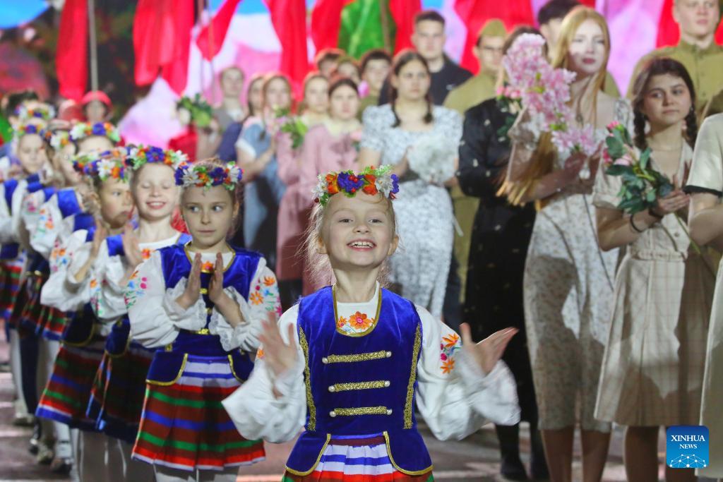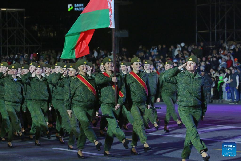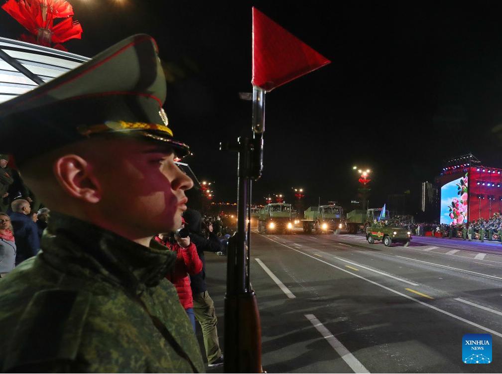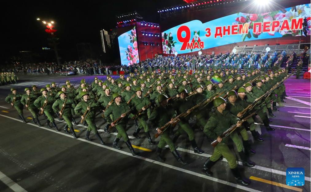Performers attend a rehearsal for the Victory Day military parade in Minsk, capital of Belarus, May 2, 2025. (Photo by Henadz Zhinkov/Xinhua)