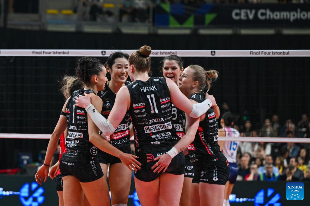 Players of Carraro Imoco Conegliano celebrate scoring during the women's final between Carraro Imoco Conegliano of Italy and Savino Del Bene Scandicci of Italy at CEV Champions League Volley 2025 in Istanbul, Trkiye, May 4, 2025. (Xinhua/Liu Lei)