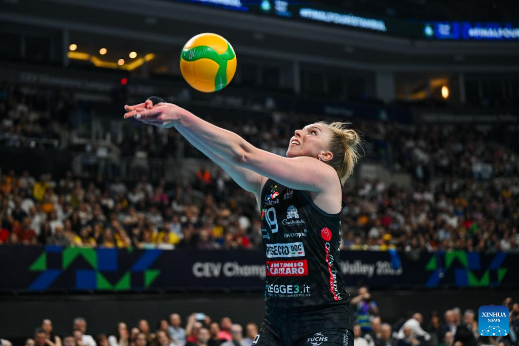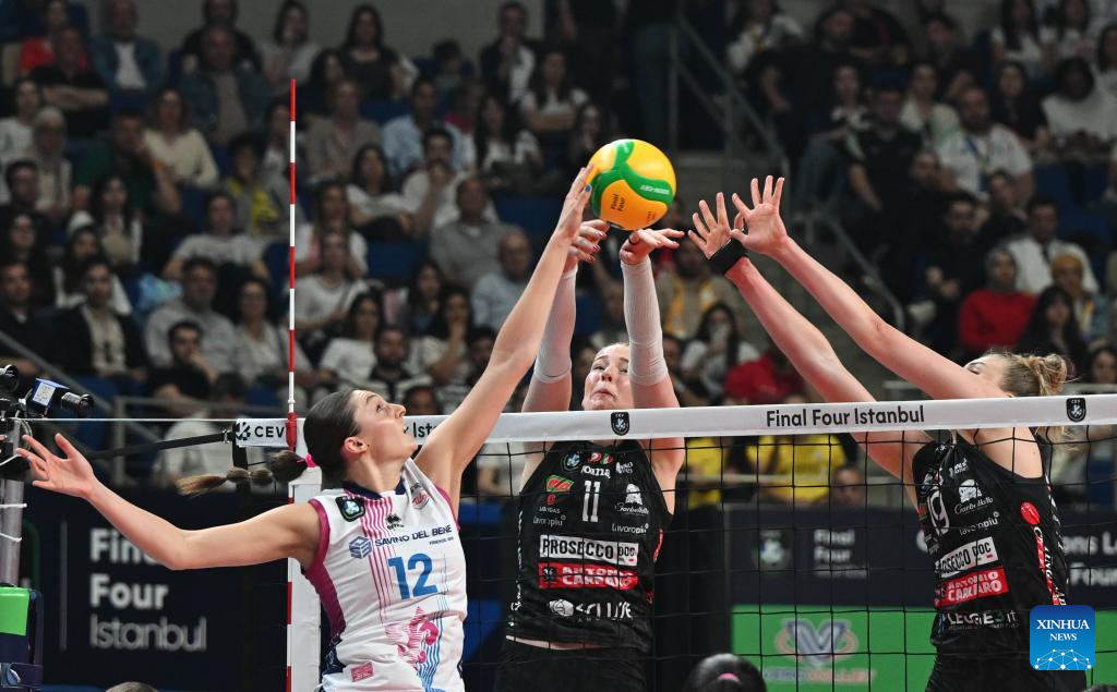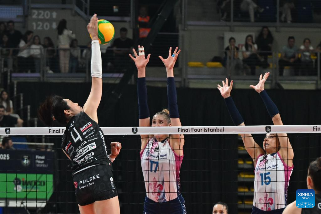 Kara Bajema (L) of spikes the ball during the women's final between Carraro Imoco Conegliano of Italy and Savino Del Bene Scandicci of Italy at CEV Champions League Volley 2025 in Istanbul, Trkiye, May 4, 2025. (Xinhua/Liu Lei)