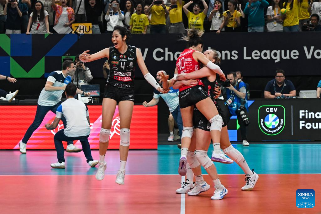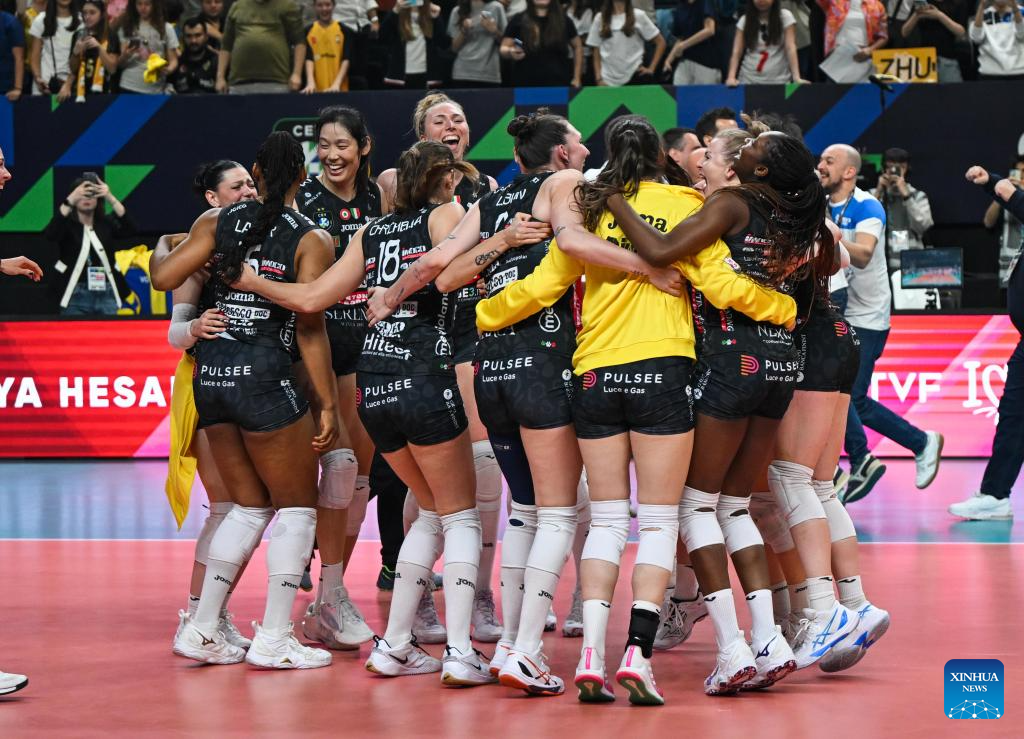 Players of Carraro Imoco Conegliano celebrate winning the women's final between Carraro Imoco Conegliano of Italy and Savino Del Bene Scandicci of Italy at CEV Champions League Volley 2025 in Istanbul, Trkiye, May 4, 2025. (Xinhua/Liu Lei)