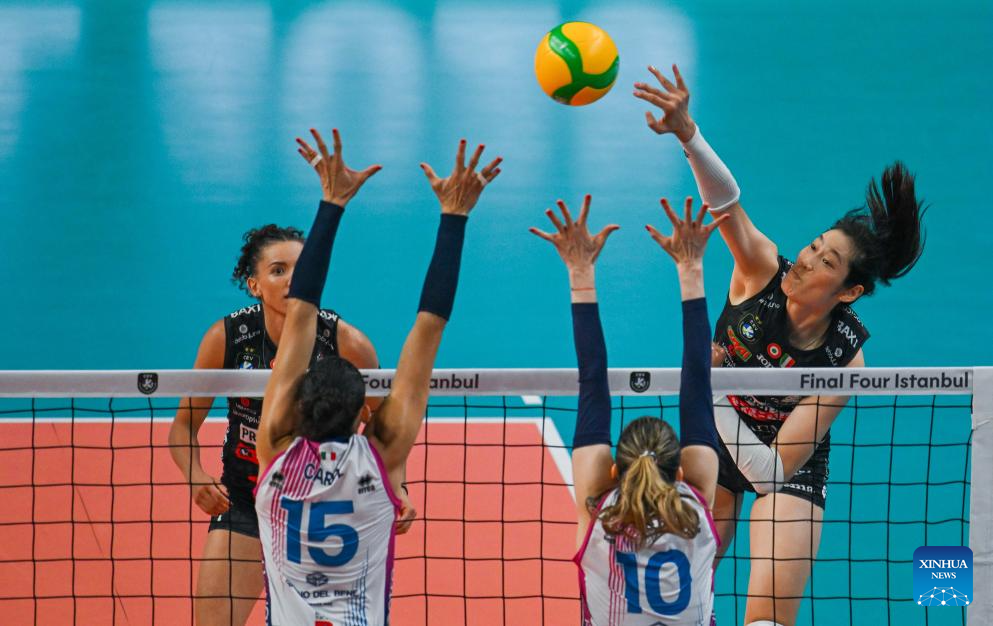 Zhu Ting (L) of Carraro Imoco Conegliano spikes the ball during the women's final between Carraro Imoco Conegliano of Italy and Savino Del Bene Scandicci of Italy at CEV Champions League Volley 2025 in Istanbul, Trkiye, May 4, 2025. (Xinhua/Liu Lei)