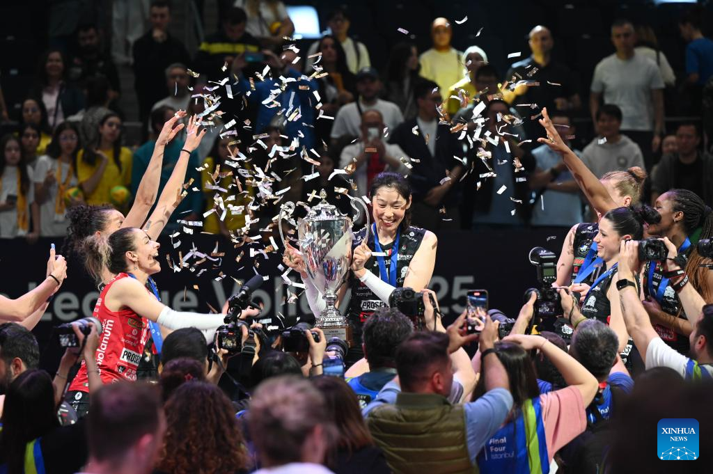 Zhu Ting (C) of Carraro Imoco Conegliano celebrates with the trophy during the awarding ceremony for the women's final between Carraro Imoco Conegliano of Italy and Savino Del Bene Scandicci of Italy at CEV Champions League Volley 2025 in Istanbul, Trkiye, May 4, 2025. (Xinhua/Liu Lei)