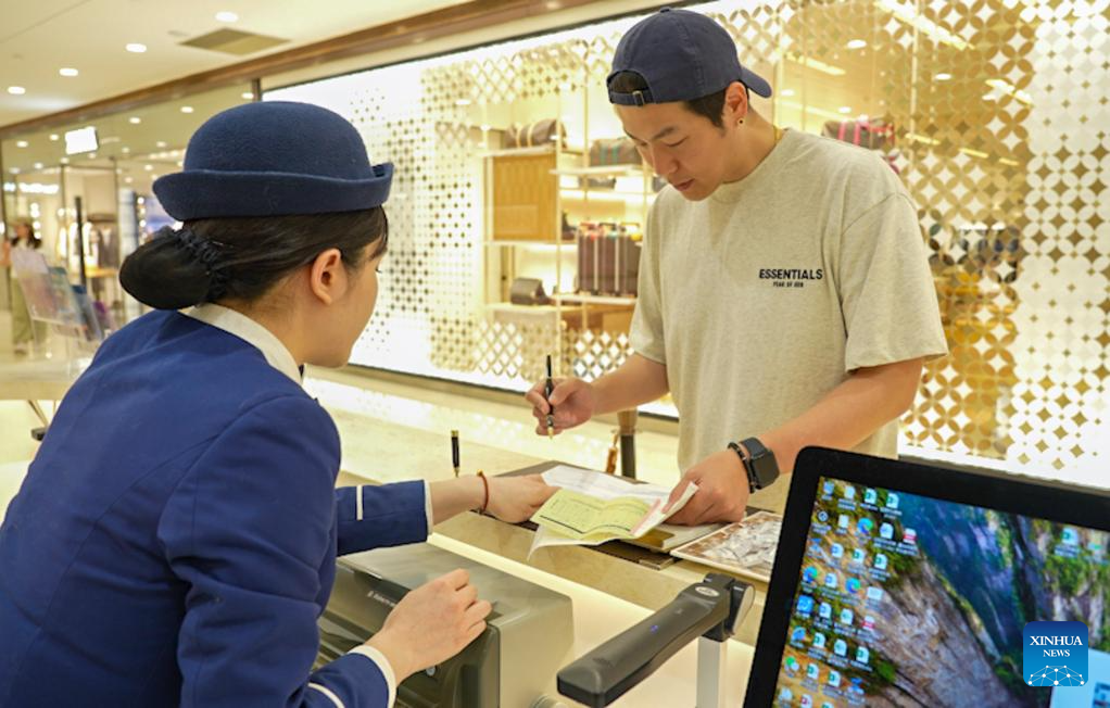 A staff member provides the departure tax refund service for a tourist from Russia at a shopping plaza in Beijing, capital of China, April 30, 2025. (Xinhua/Ju Huanzong)