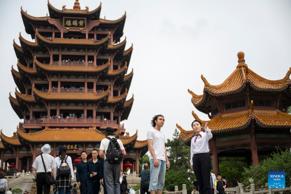 Docent Hu Yanan (R, front) provides English service for Egyptian tourist Khaled Metwally Abdelhay Mohamed (L, front) at the Yellow Crane Tower, or Huanghelou, a landmark in Wuhan, central China's Hubei Province, April 30, 2025. (Xinhua/Wu Zhizun)