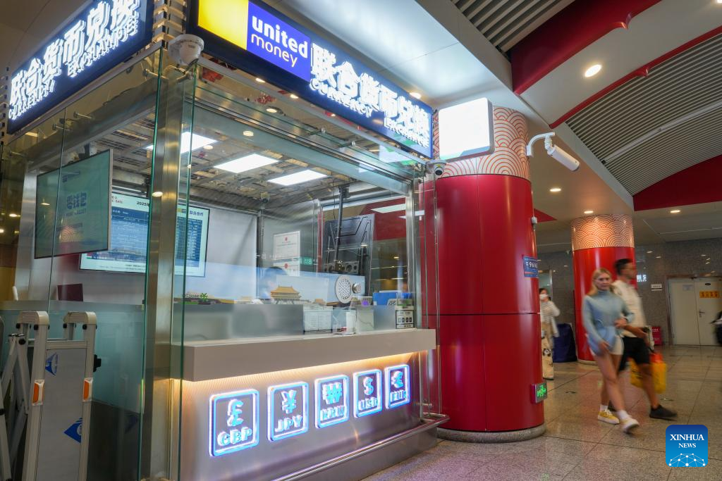 People walk past the Currency Exchange in Wangfujing station of Beijing Subway Line 8 in Beijing, capital of China, April 28, 2025. (Xinhua/Ju Huanzong)