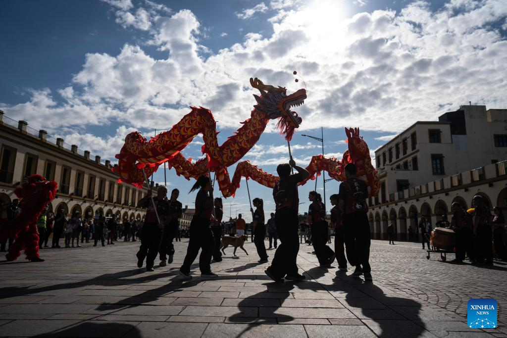 Performers present a dragon dance during the "China in Lujan" festival in Lujan, Argentina, on May 4, 2025. The festival, featuring typical Chinese music, traditional dance, tasty food and martial arts, was held here on Sunday. (Photo by Martin Zabala/Xinhua)