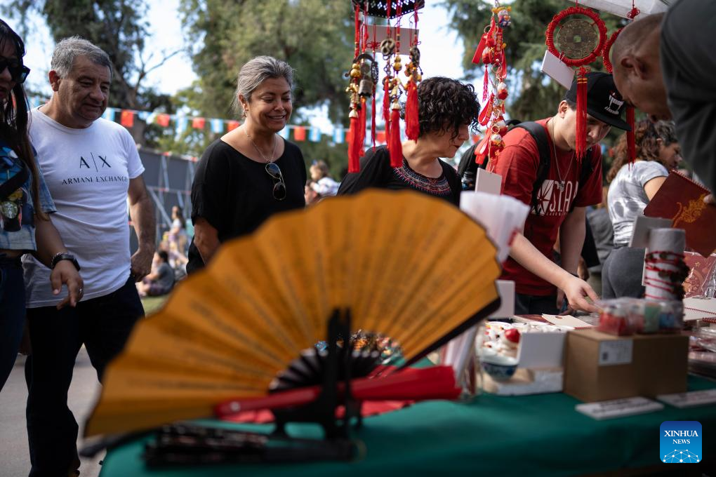 People visit the stands during the "China in Lujan" festival in Lujan, Argentina, on May 4, 2025. The festival, featuring typical Chinese music, traditional dance, tasty food and martial arts, was held here on Sunday. (Photo by Martin Zabala/Xinhua)