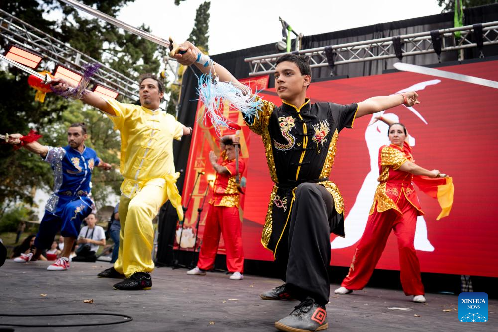 Performers present a Chinese sword dance during the "China in Lujan" festival in Lujan, Argentina, on May 4, 2025. The festival, featuring typical Chinese music, traditional dance, tasty food and martial arts, was held here on Sunday. (Photo by Martin Zabala/Xinhua)