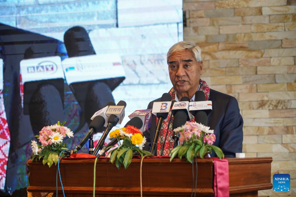 Nepal's former Prime Minister and President of the Nepali Congress Sher Bahadur Deuba speaks at the photo exhibition "legacy of friendship: 70 years of Nepal-China relations through the lens" in Kathmandu, Nepal, on May 5, 2025. The photo exhibition was held in the Nepali capital on Monday to mark the 70th anniversary of Nepal-China diplomatic relations. (Photo by Hari Maharjan/Xinhua)