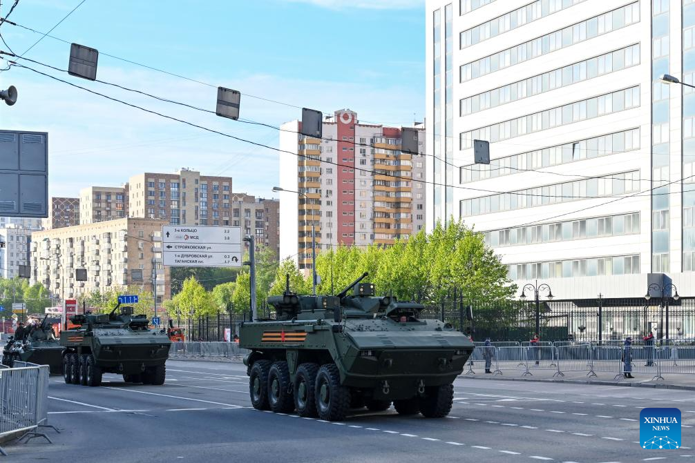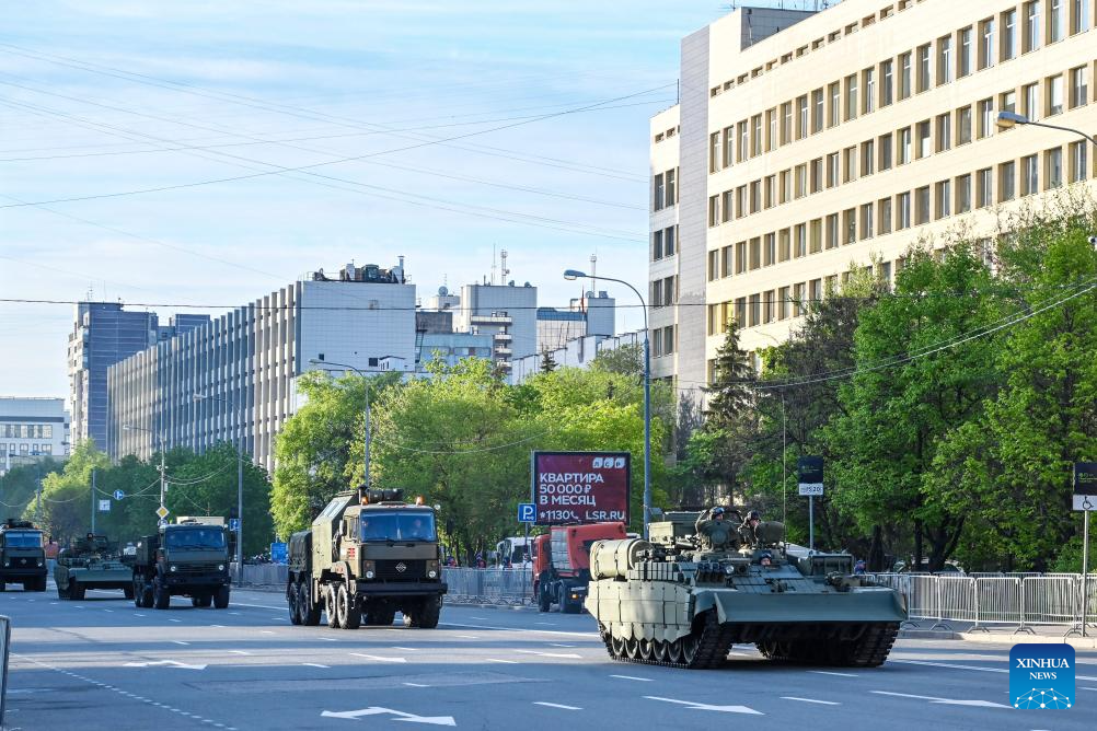 Vehicles drive through the downtown to attend a rehearsal for the Victory Day military parade, which marks the 80th anniversary of the Victory in the Soviet Union's Great Patriotic War, in Moscow, Russia, May 7, 2025. (Xinhua/Cao Yang)