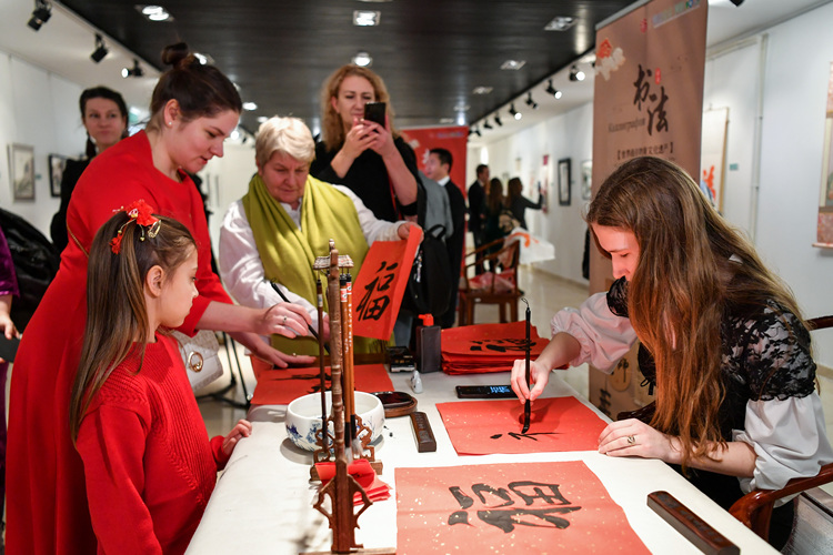 Visitors experience Chinese calligraphy at the China Cultural Center in Moscow, Russia, Jan 25, 2025. (Photo/Xinhua)