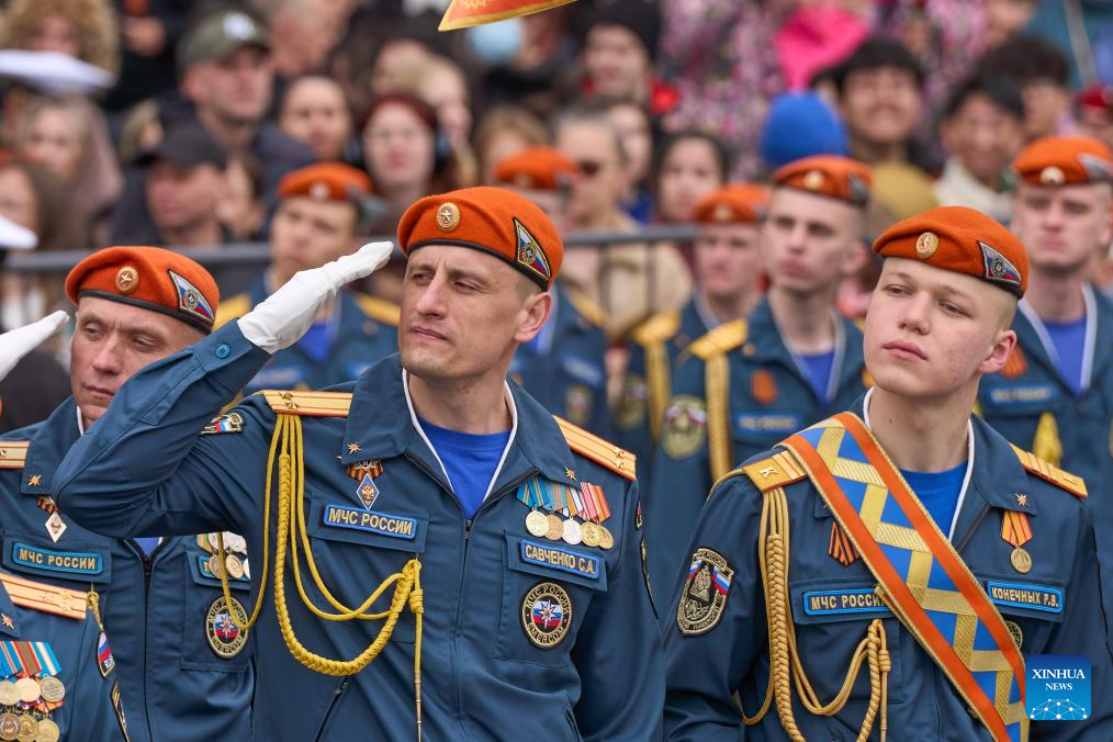 Servicemen moving in formation are pictured during a military parade to commemorate the 80th anniversary of the Victory in the Great Patriotic War in Vladivostok, Russia, May 9, 2025. (Photo by Guo Feizhou/Xinhua)