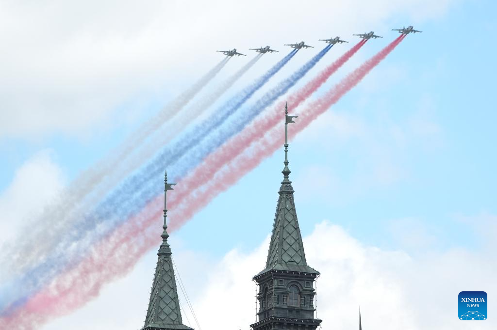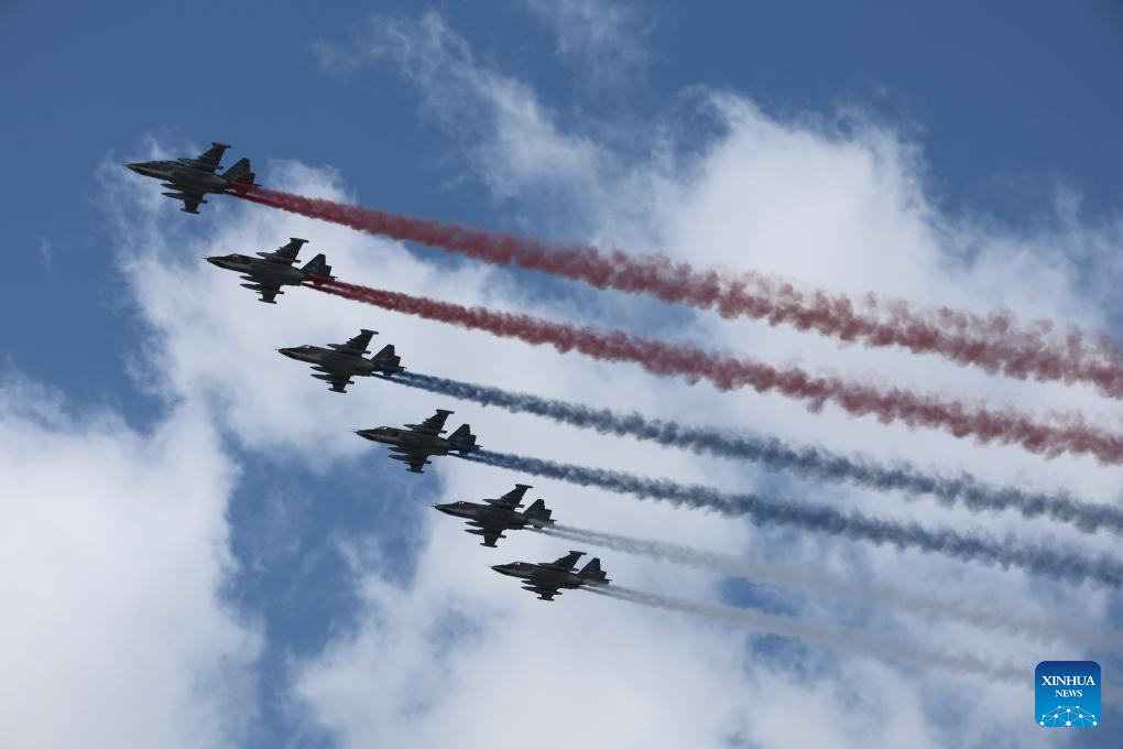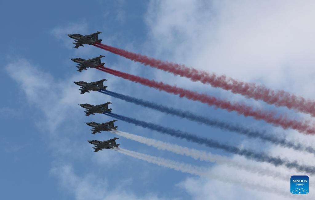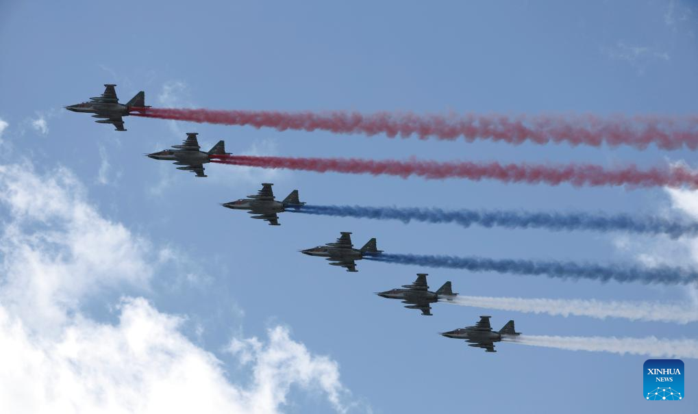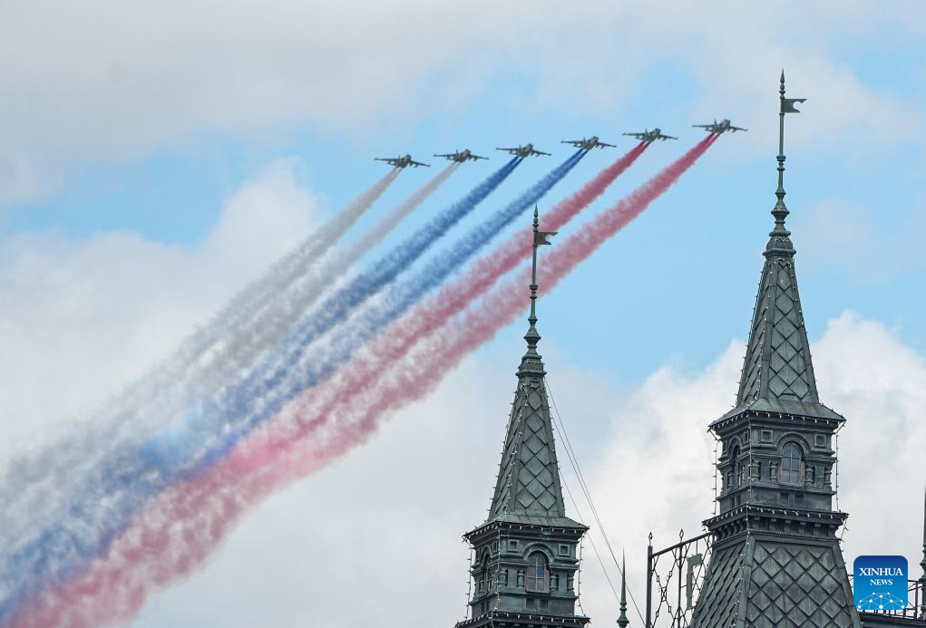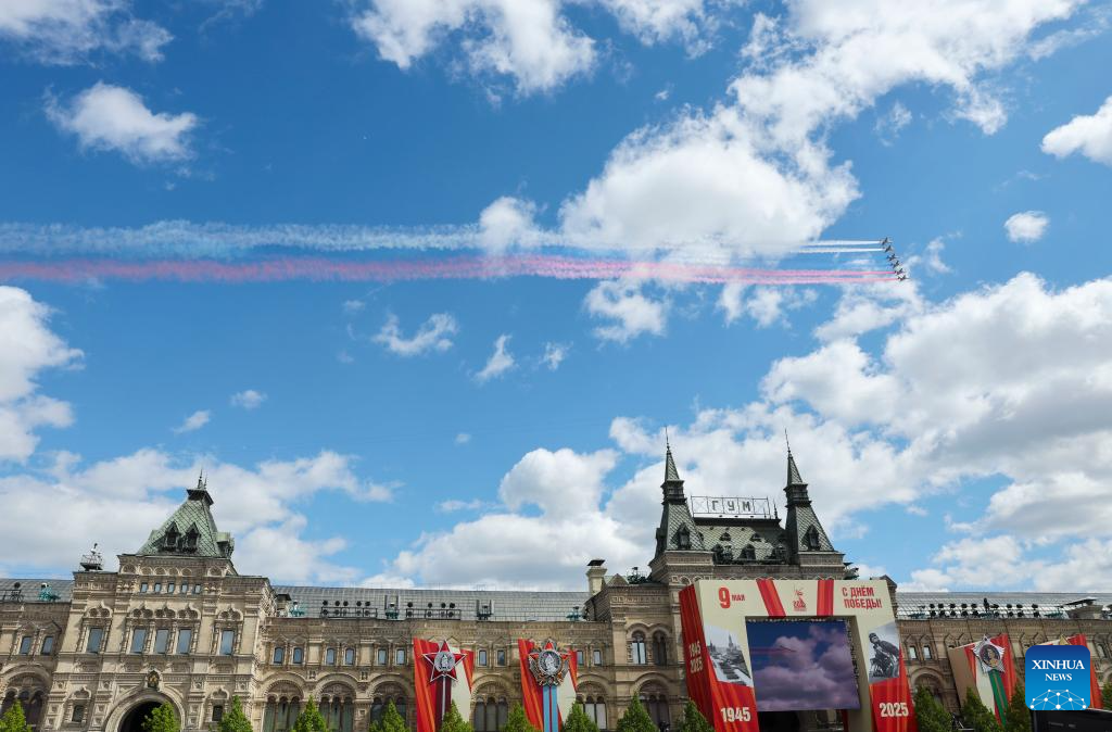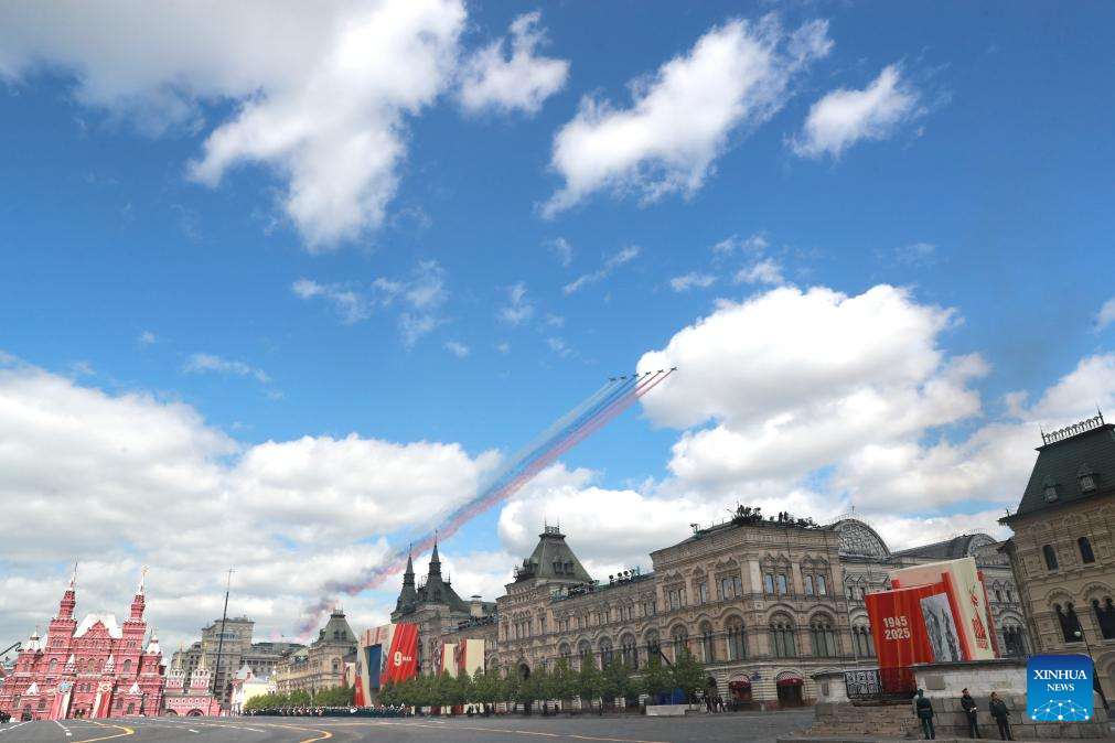 Aircraft fly in formation during a grand parade marking the 80th anniversary of the victory in the Soviet Union's Great Patriotic War in Moscow, Russia, May 9, 2025. (Xinhua/Wang Ye)