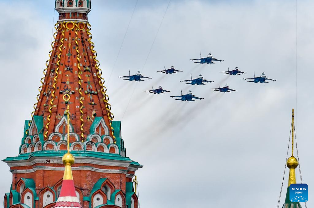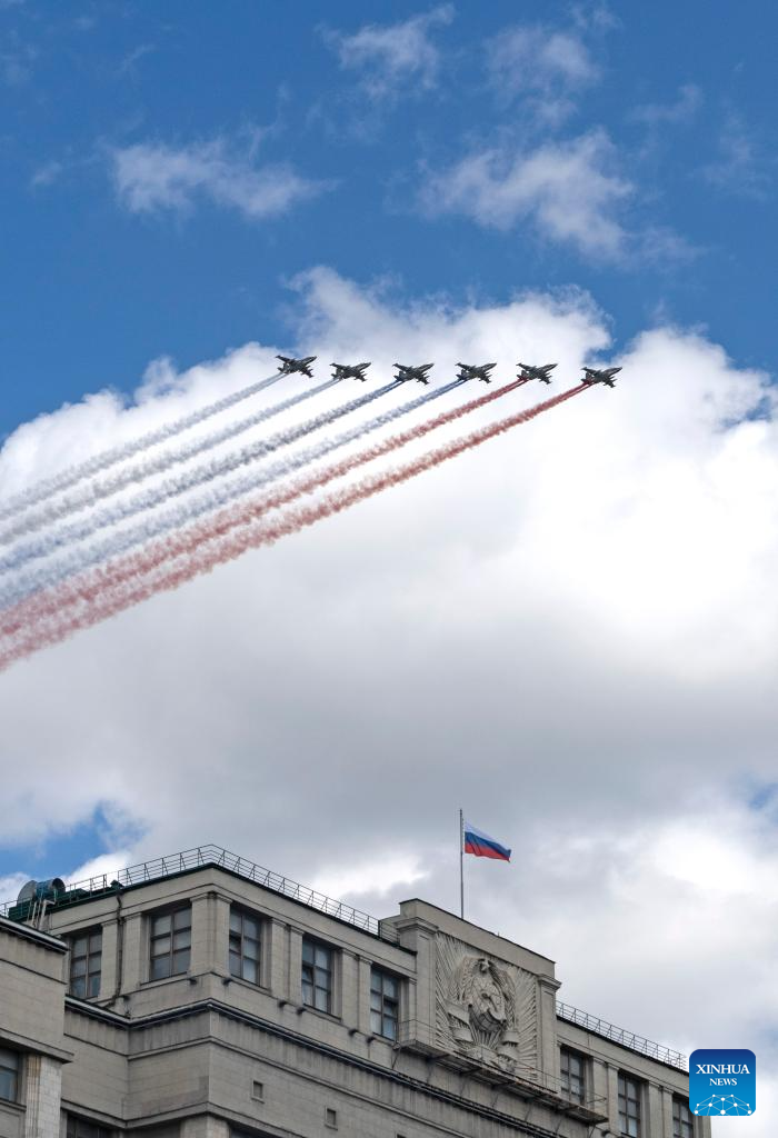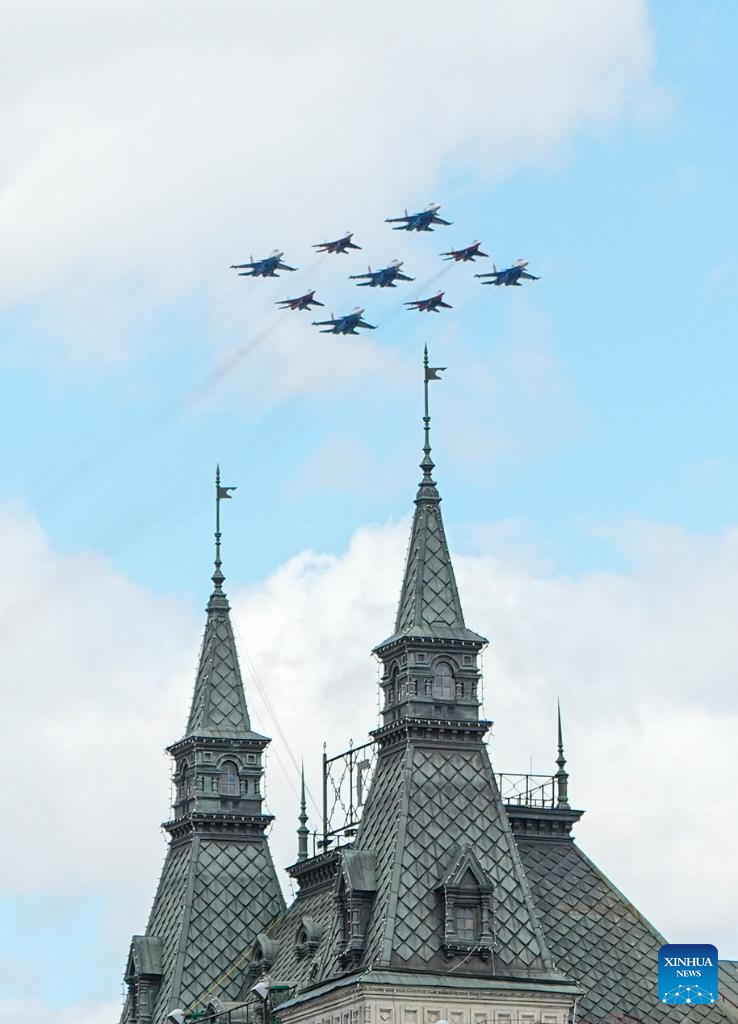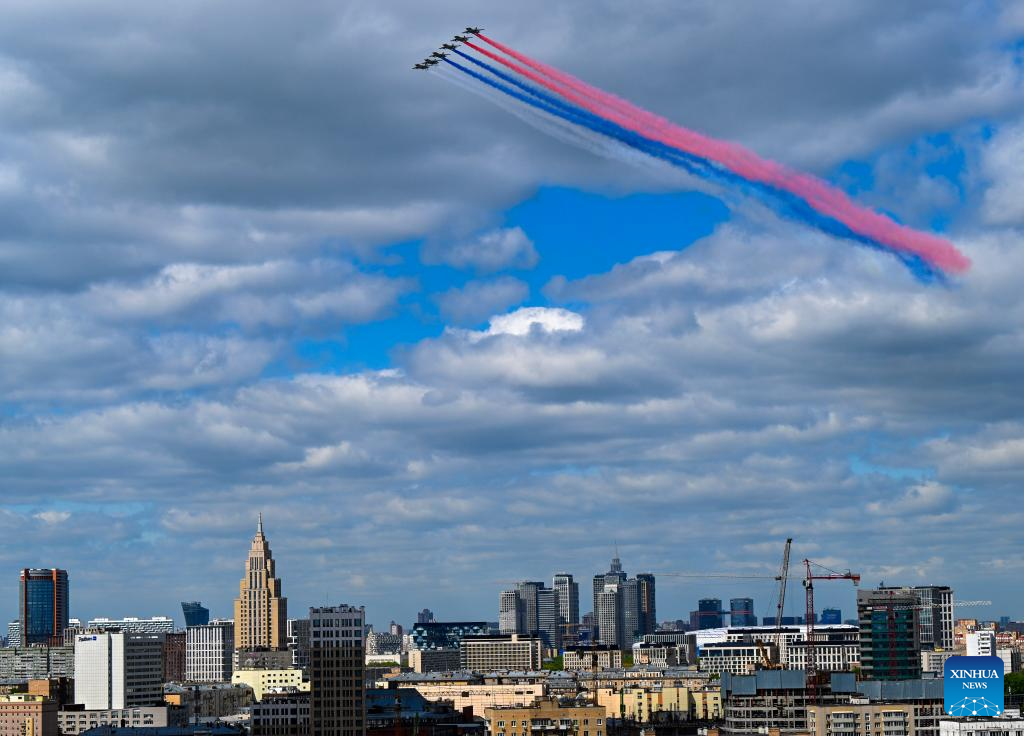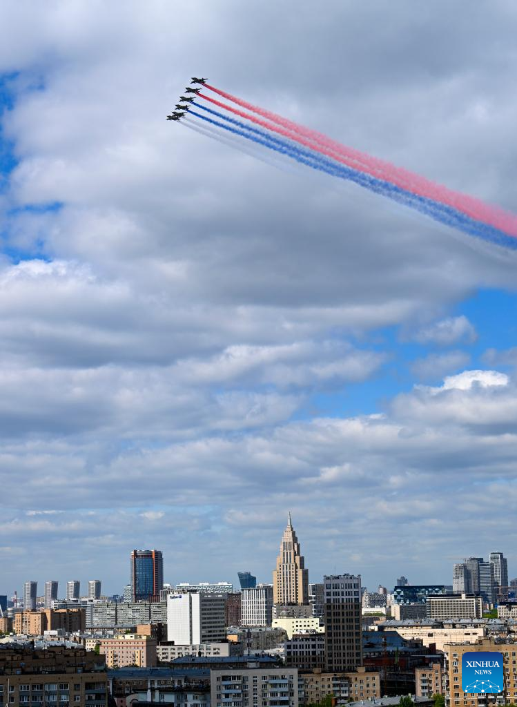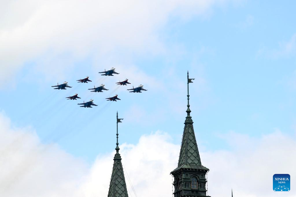 Aircraft fly in formation during a grand parade marking the 80th anniversary of the victory in the Soviet Union's Great Patriotic War in Moscow, Russia, May 9, 2025. (Xinhua/Wang Ye)