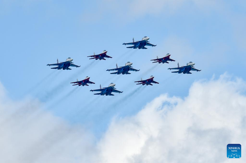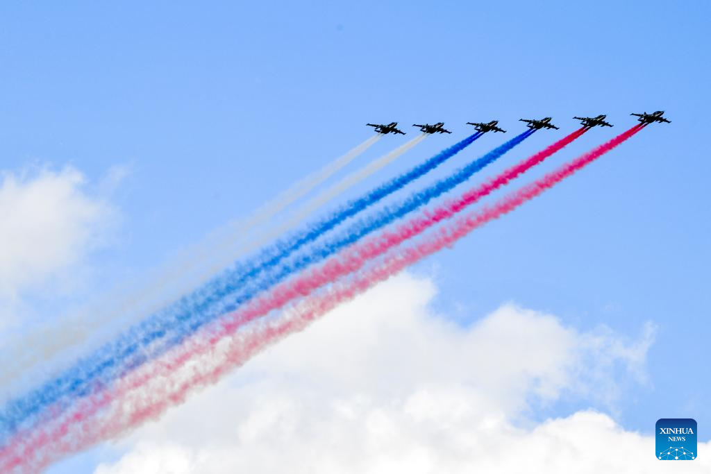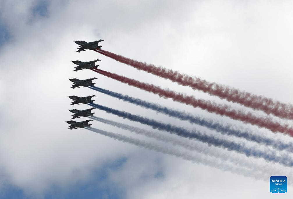 Aircraft fly in formation during a grand parade marking the 80th anniversary of the victory in the Soviet Union's Great Patriotic War in Moscow, Russia, May 9, 2025. (Xinhua/Zhang Ling)
