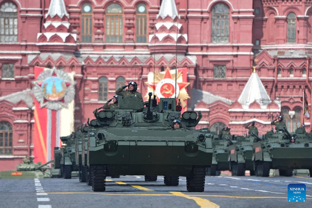 Infantry fighting vehicles march during a grand parade marking the 80th anniversary of the victory in the Soviet Union's Great Patriotic War in Moscow, Russia, May 9, 2025. (Xinhua/Lai Xiangdong)