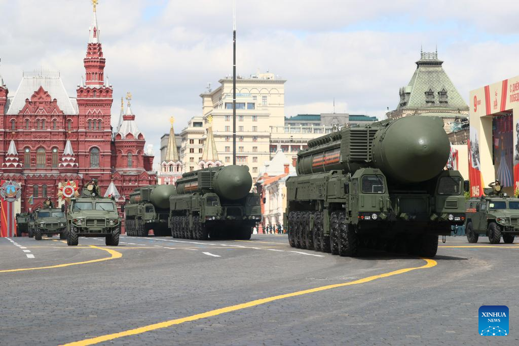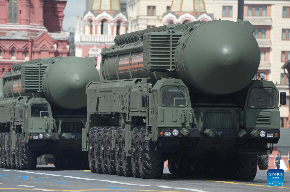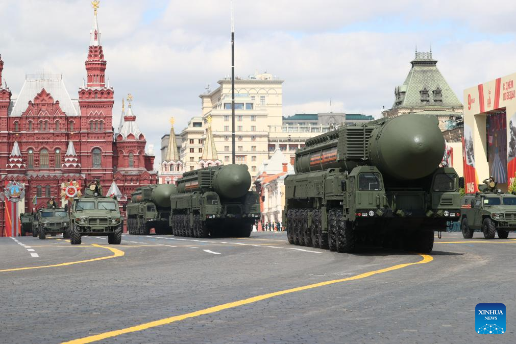 Intercontinental ballistic missile systems are seen during a grand parade marking the 80th anniversary of the victory in the Soviet Union's Great Patriotic War in Moscow, Russia, May 9, 2025. (Xinhua/Lai Xiangdong)